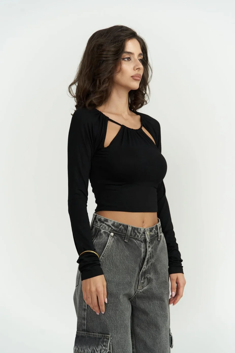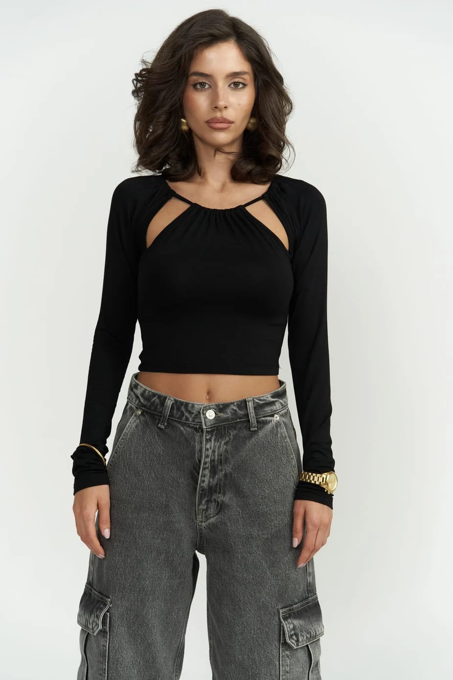 برش کش دار با آستین های بلند با جزئیات برش و جلو جمع آوری جزئیات.