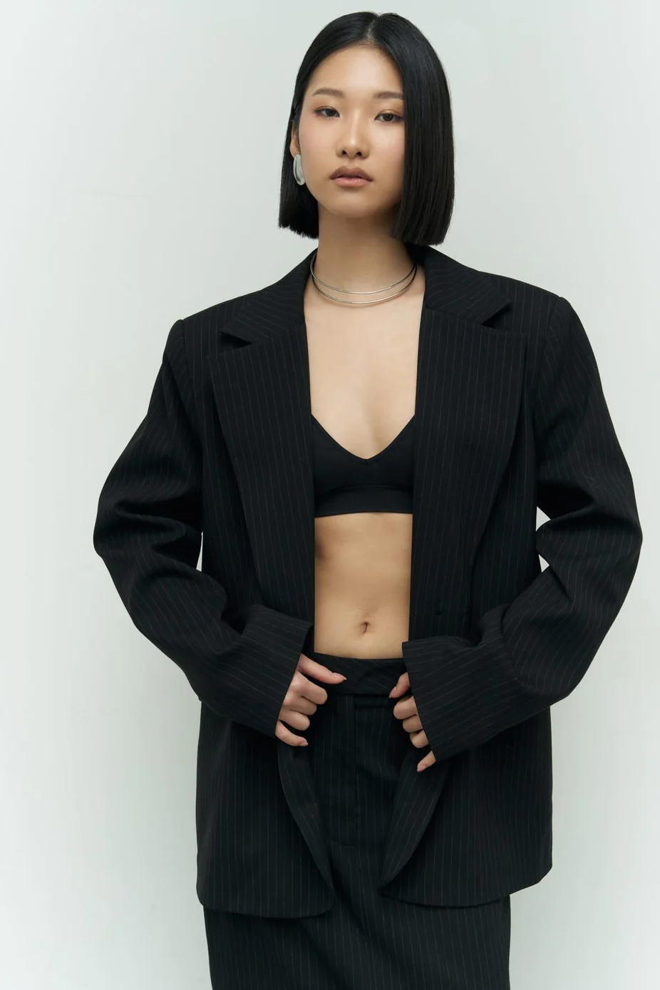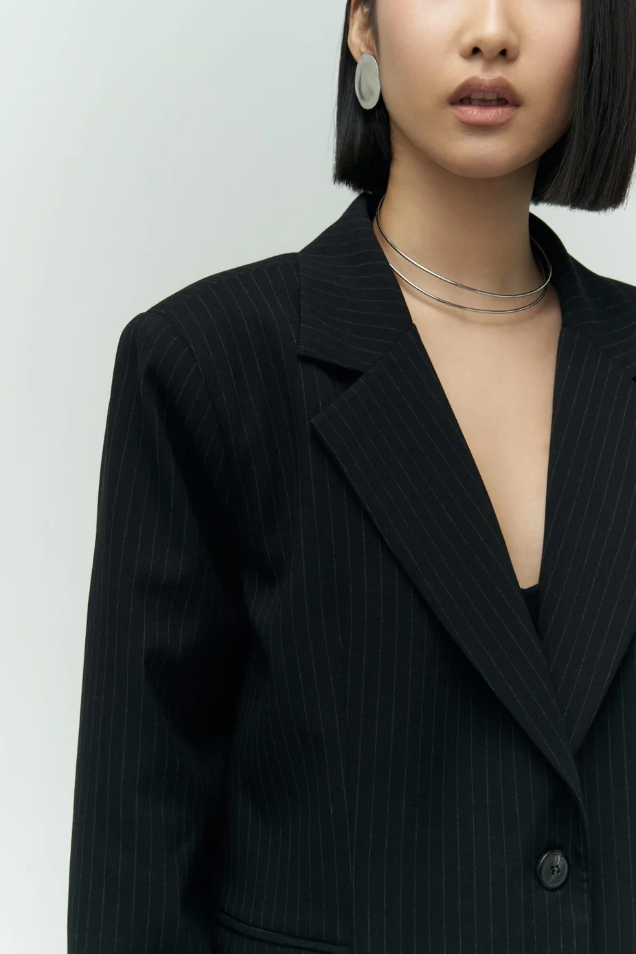 طرح راه راه. مدل بزرگ. یقه V-cut. آستین بلند. شانه هایش قالبی است. دو جیب خمیده در جلو. جلو دکمه دار. ژاکت بلیزر آستردار.