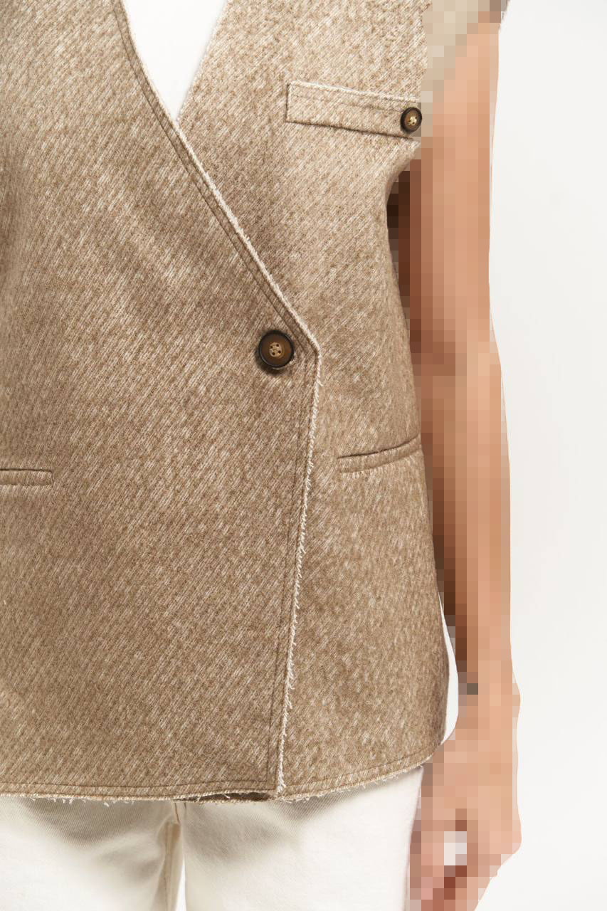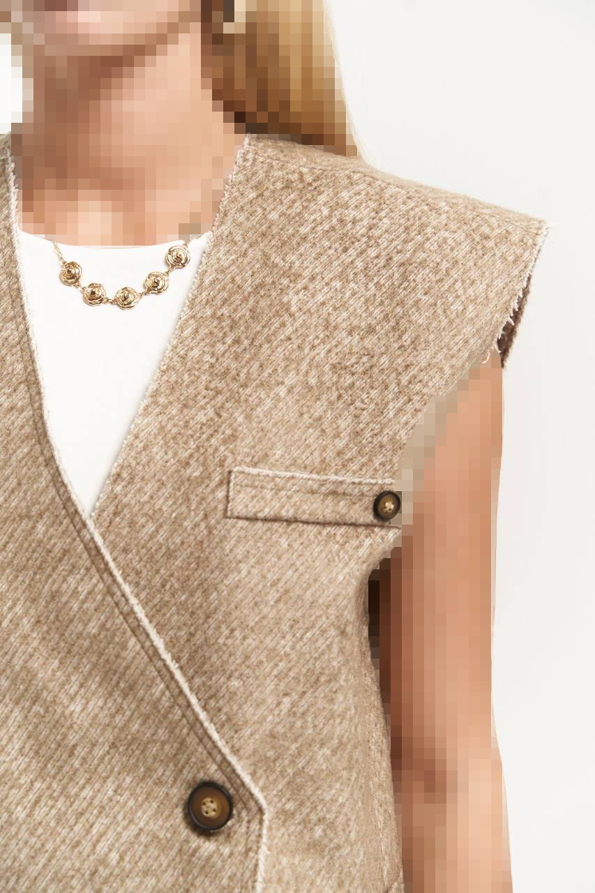 جلیقه یقه V بافت دار با سوراخ های بازو کوتاه. جیب جلوی زینتی. آستر رنگی همسان. شکاف لبه جانبی. برش دو سینه با بسته شدن دکمه در جلو. طراحی خط دار.