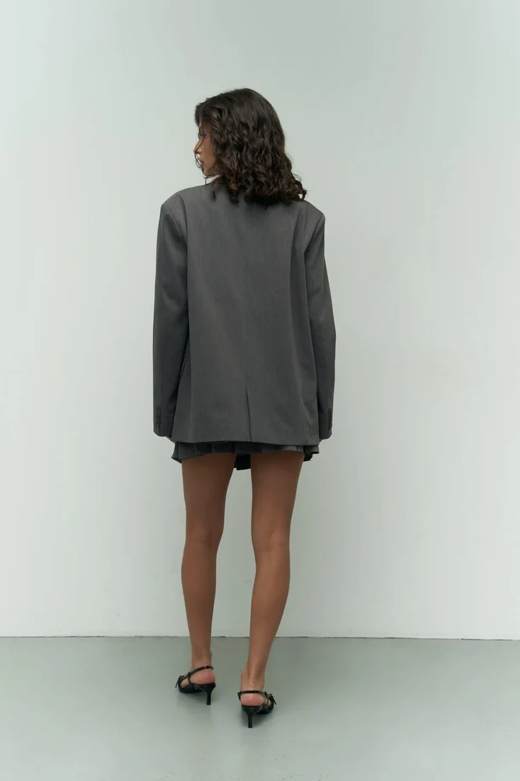 کت کتانی بزرگ با ظاهری شبیه جلیقه. یقه V-cut. آستین بلند. شانه هایش قالبی است. دو جیب خمیده در جلو. جلو دکمه دار. خط کشی شده.