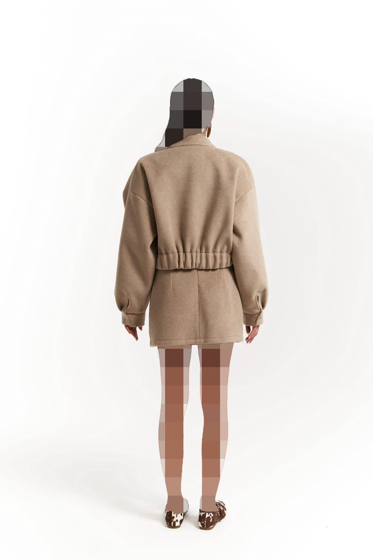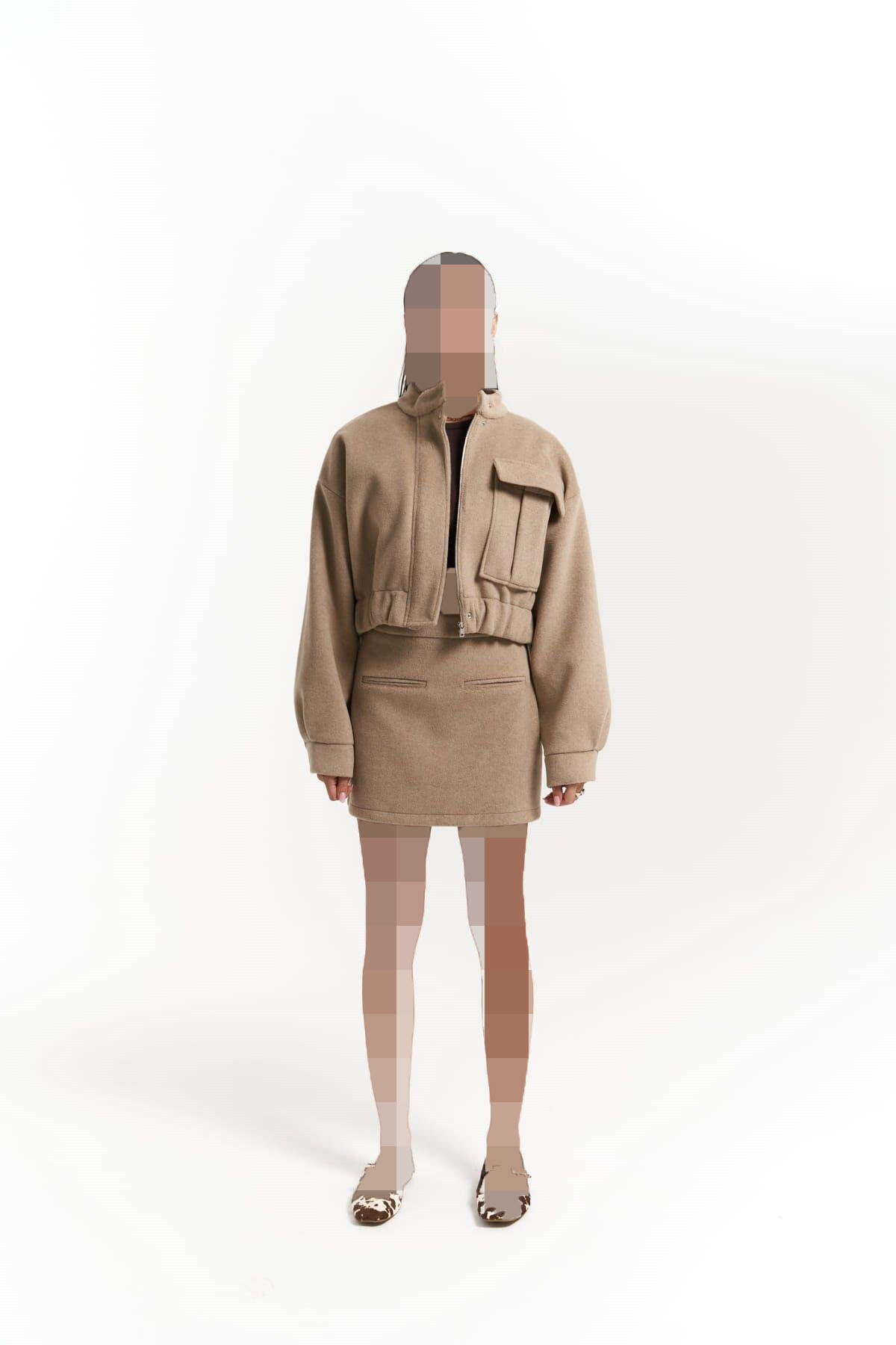 ژاکت برش بافت نرم با زیپ، جزئیات محکم، یقه خدمه. آستین بلند، طراحی جیب بزرگ جلو. دامن مینی با بافت نرم. طراحی جیب تقلبی بسته شدن زیپ مخفی پشت.