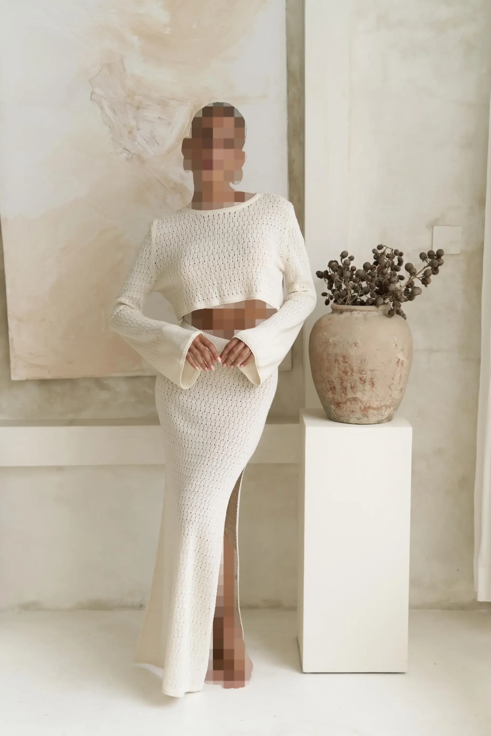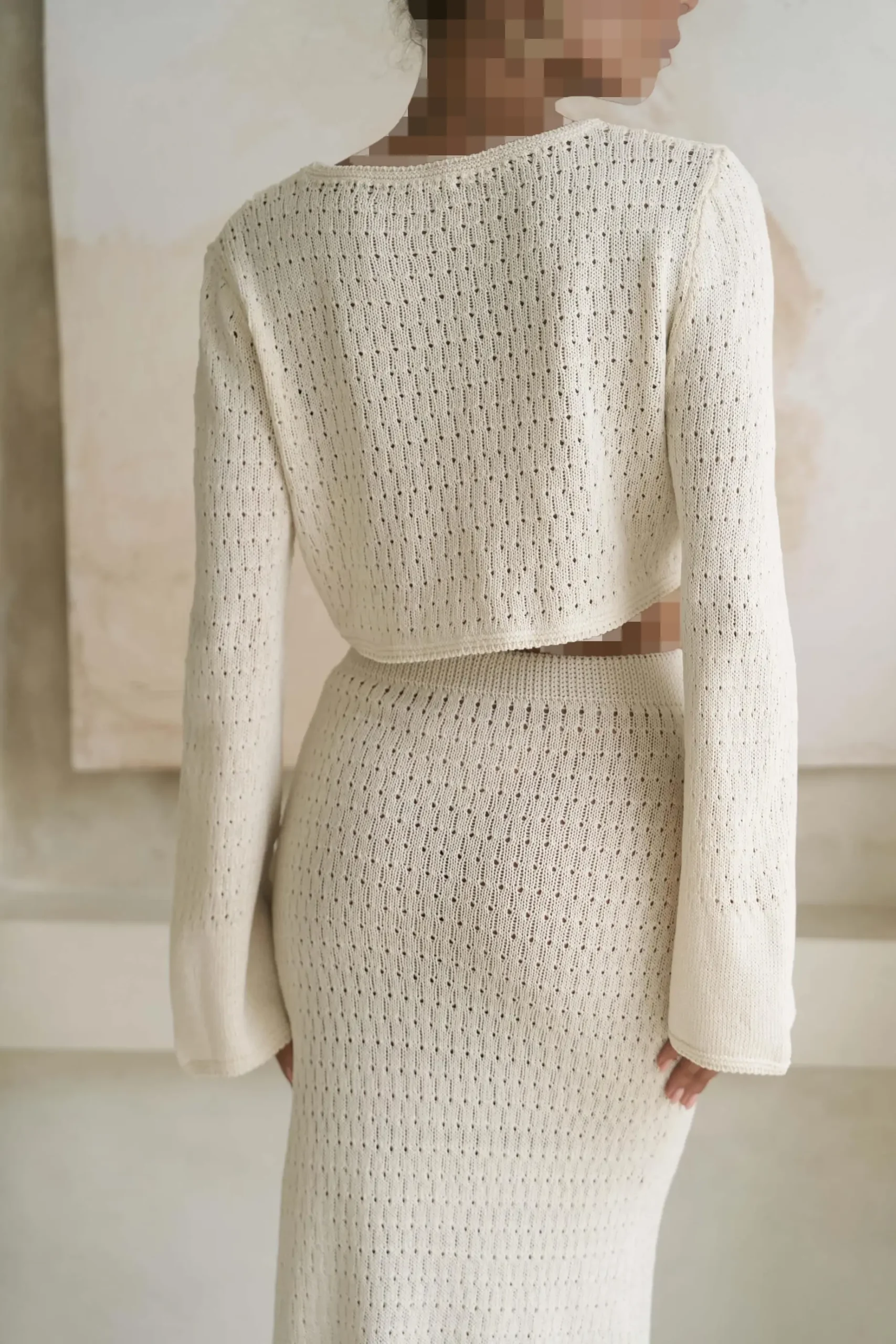 Wayhu Crew Neck Beige Knitwear Crop Skirt Set
