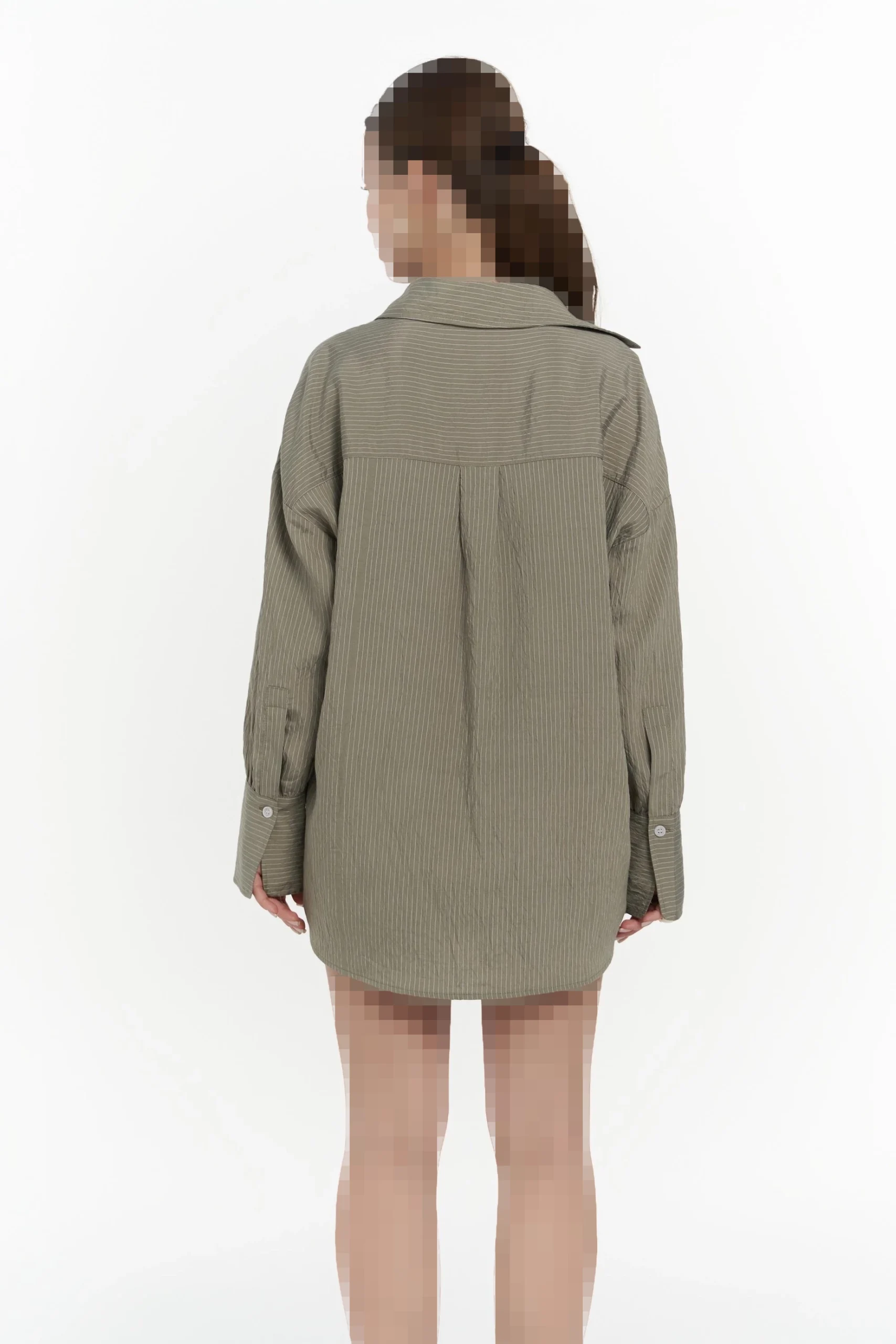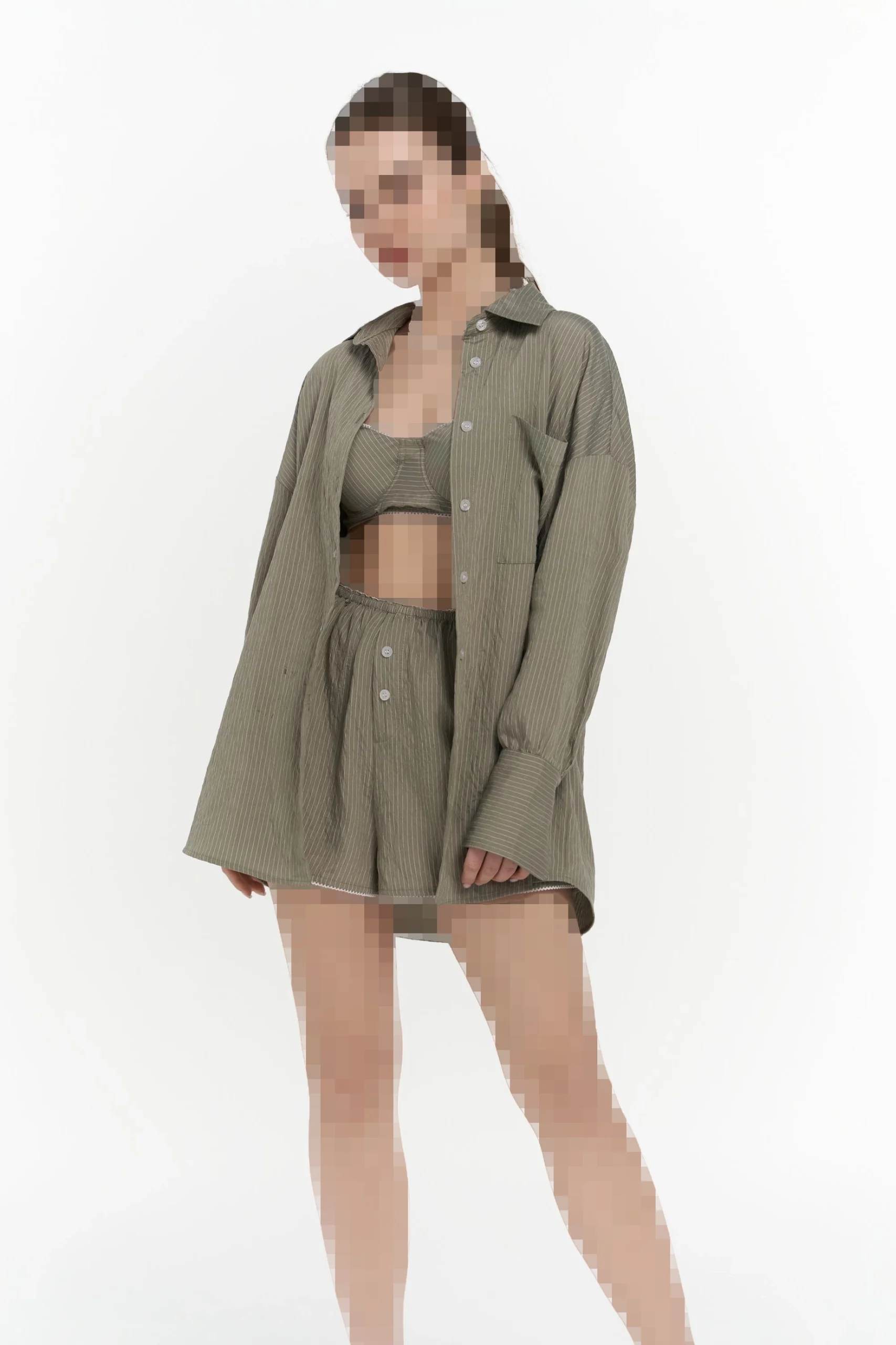 این ست شامل یک پیراهن راه راه، تاپ کوتاه و شلوارک از جنس پارچه ترکیبی نخی است. پیراهن آستین بلند با یقه کلاسیک، جلو دکمهدار، شانههای کمی افتاده و یک جیب باز روی سینه.