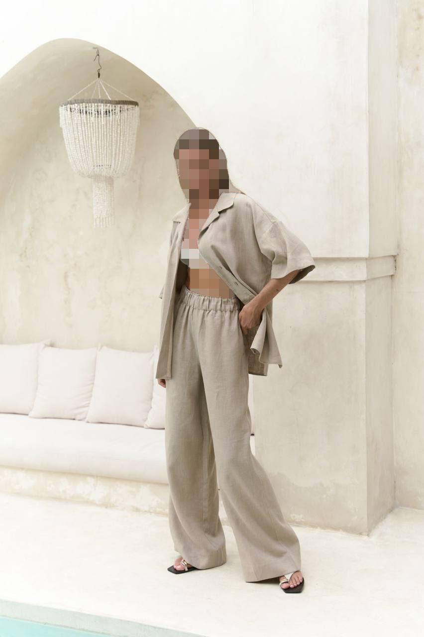 پیراهن 100% لینن یقه دار. نیم آستین، چاک در پهلو، بسته شدن دکمه در جلو. شلوار ترکیبی کتانی کمر بلند با کمربند الاستیک. جیب های کناری طراحی ساق پا پهن