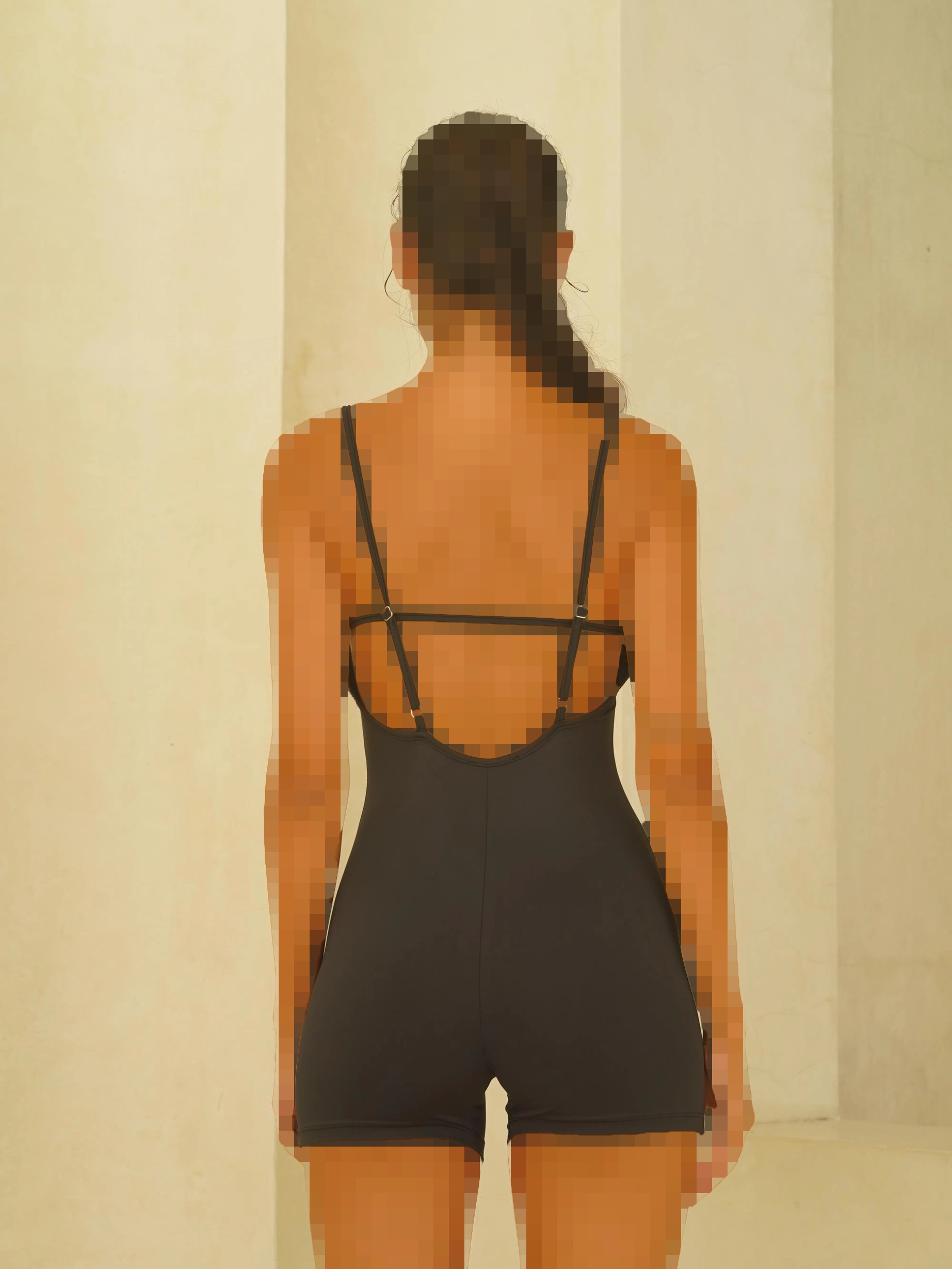 لباس سرهمی با پشت باز، بندهای نازک و شلوار کوتاه. پارچه بادوام، سریع خشک شونده و قابل تنفس. بدون کاپ، برش لیزری.