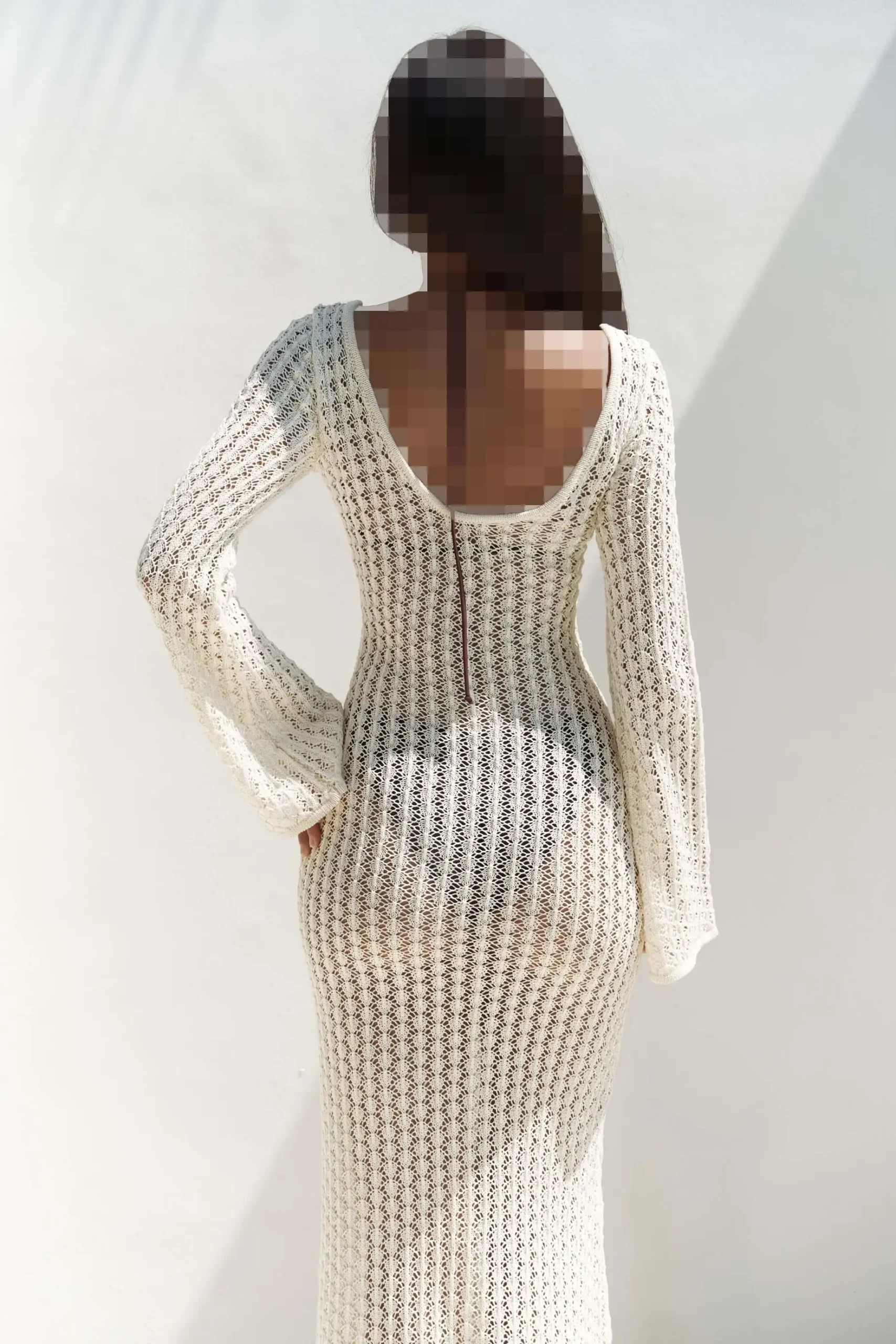 آستین بلند، یقه هفت عمیق، جزئیات کراوات، لباس بافت بلند. آستینهای گشاد و پارچه طرحدار. بدون آستر.