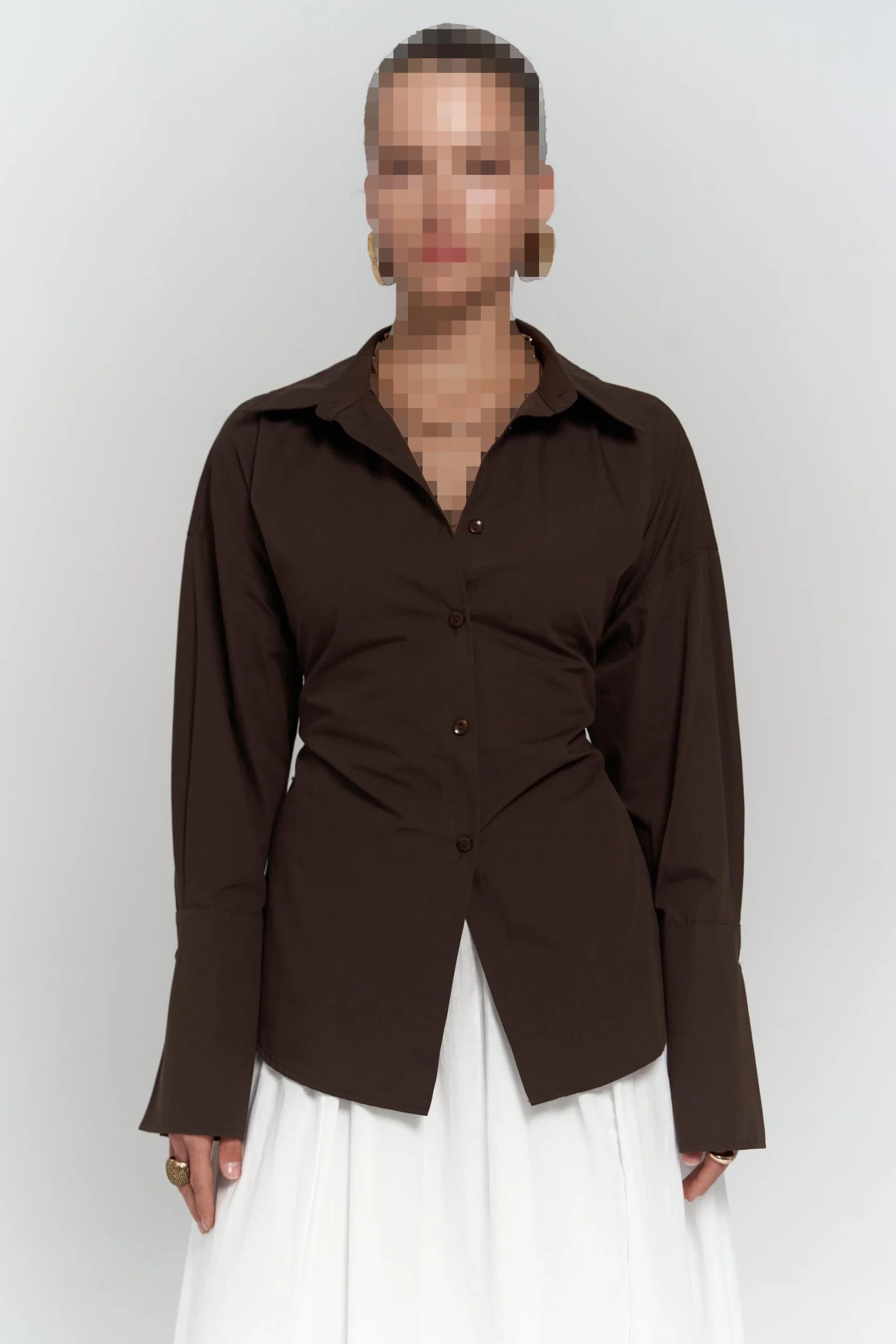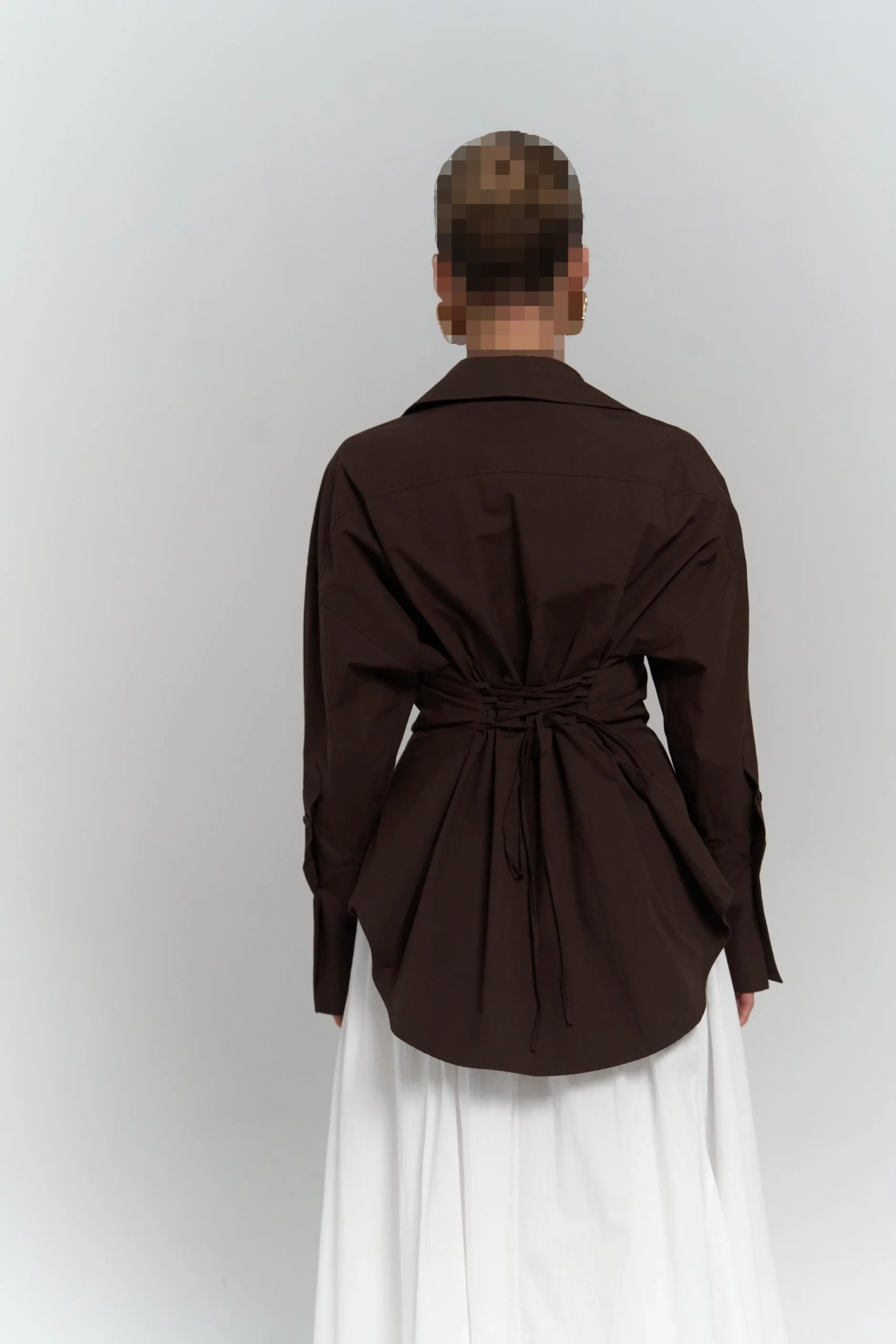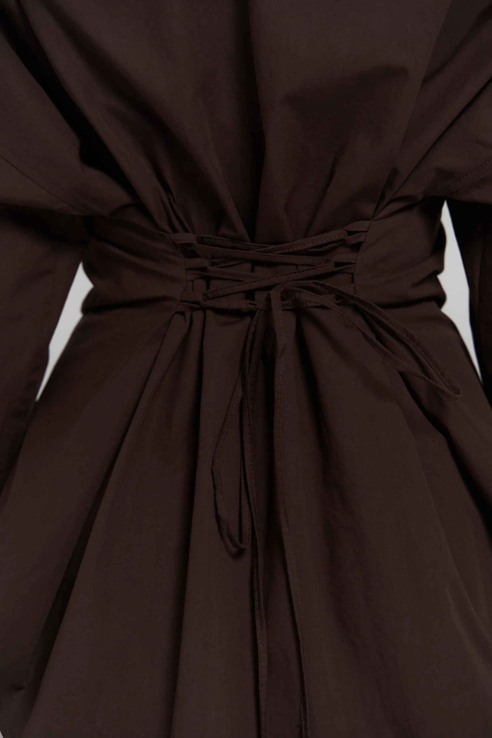 پیراهنی با یقه برگردان پهن، آستین بلند و جلو دکمهدار. جزئیات بستن طناب کمر.
