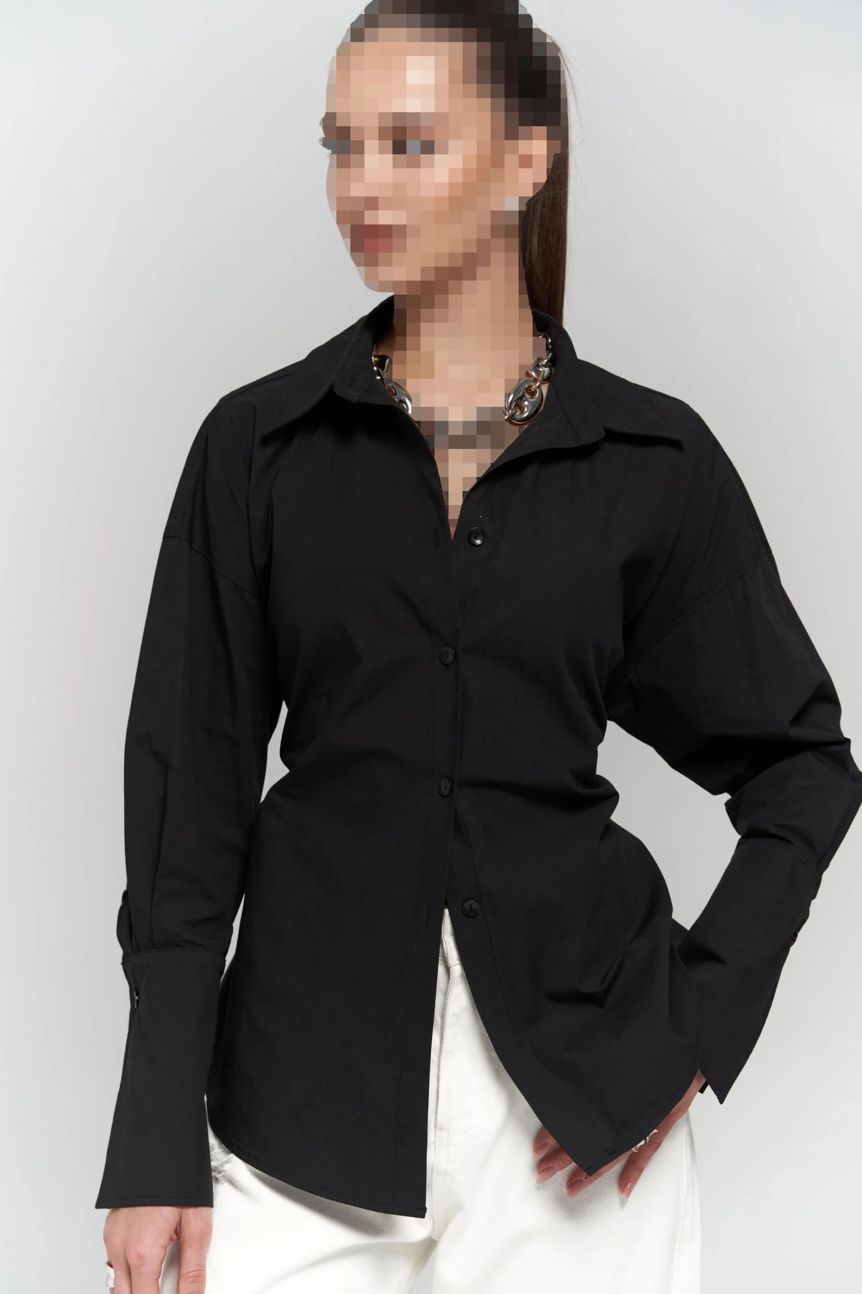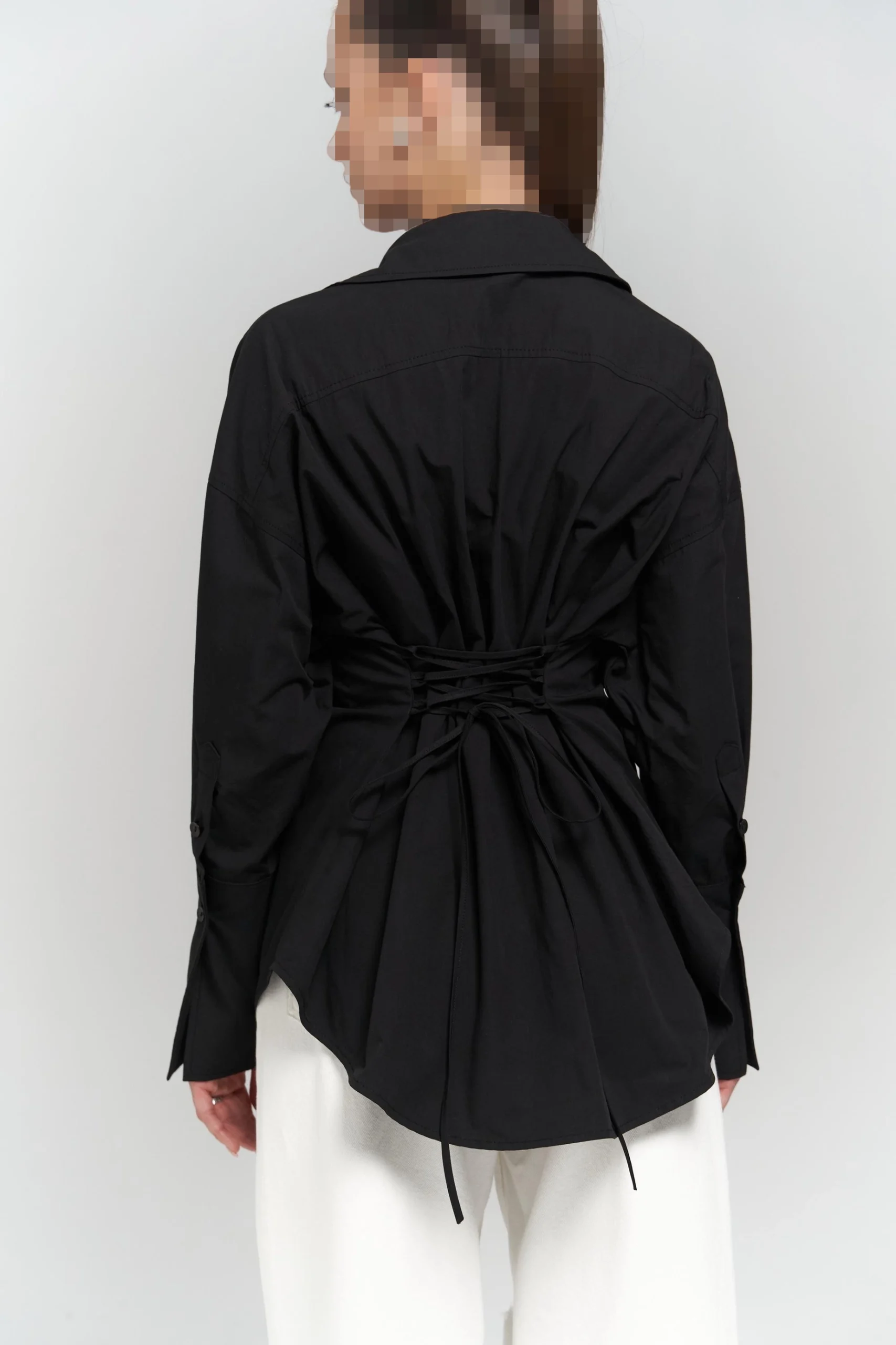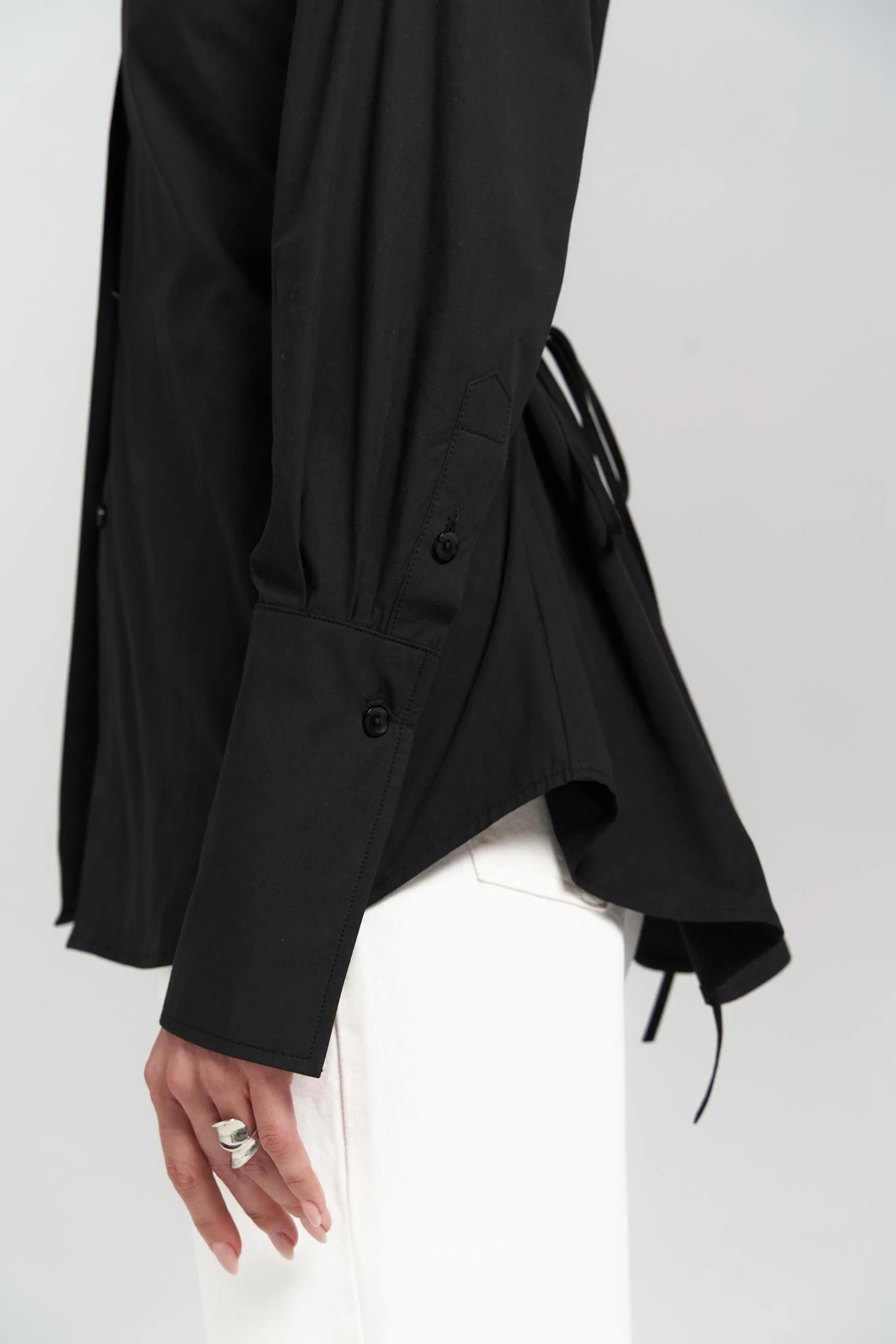 پیراهنی با یقه برگردان پهن، آستین بلند و جلو دکمهدار. جزئیات بستن طناب کمر.