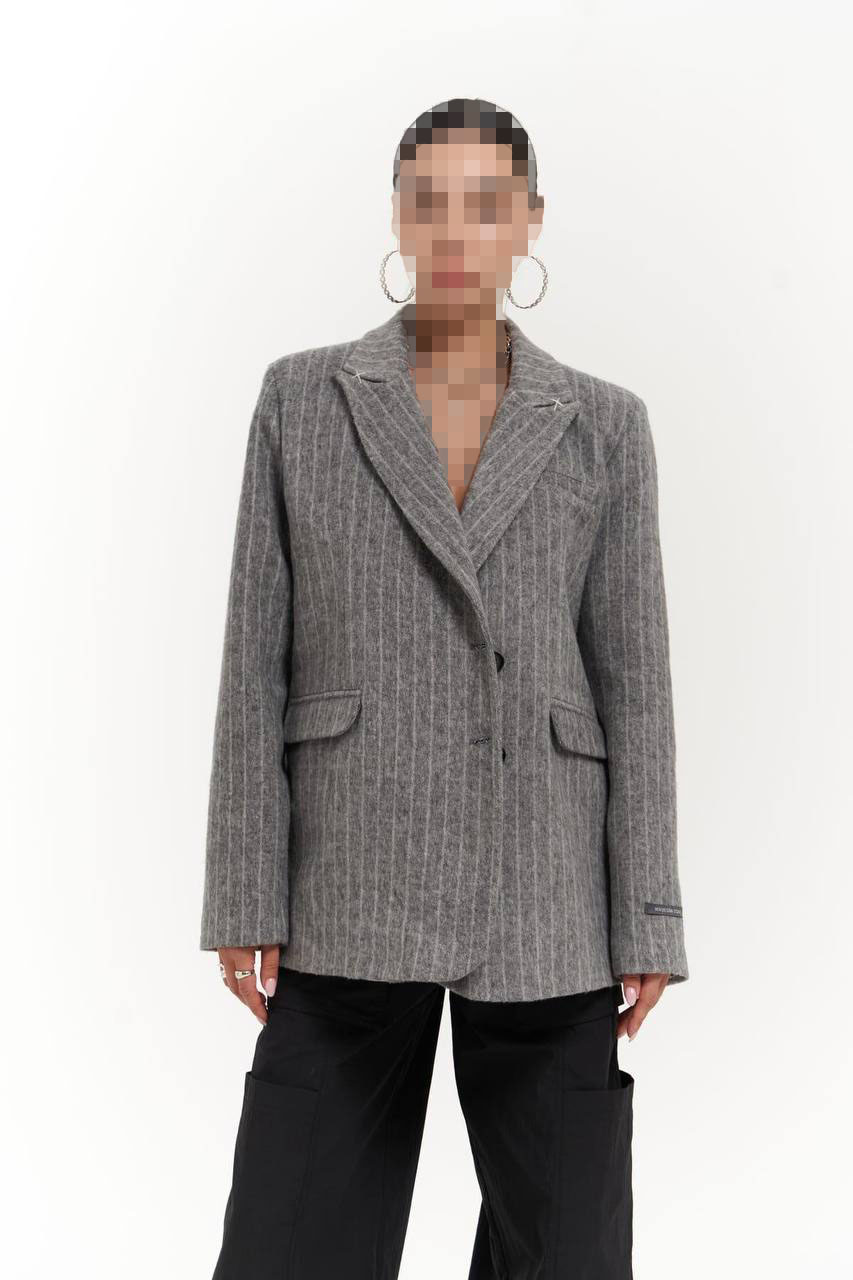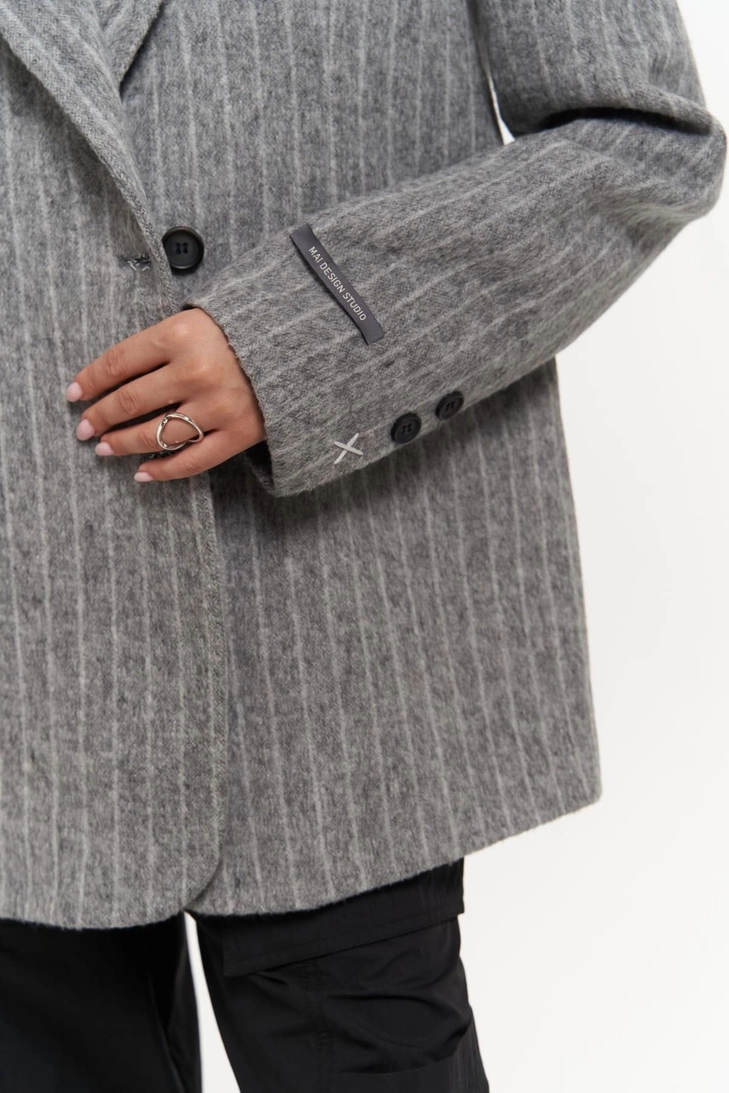 پارچه بافت دار. مدل تخت. طرح راه راه. یقه V-cut. یقه دارای طرح طناب ترکیبی است. آستین های بلند با سرآستین های دکمه دار و طرح لوگوی راه راه. دو جیب فلپ در جلو. بسته شدن دکمه جلو.