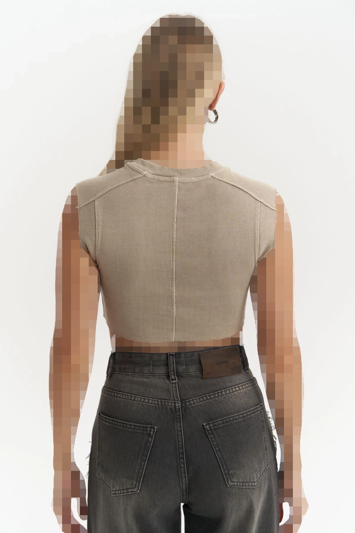 تاپ کوتاه از جنس پارچه راه راه شسته شده، آستین کوتاه، یقه گرد و نخی رنگ شده کمرنگ.