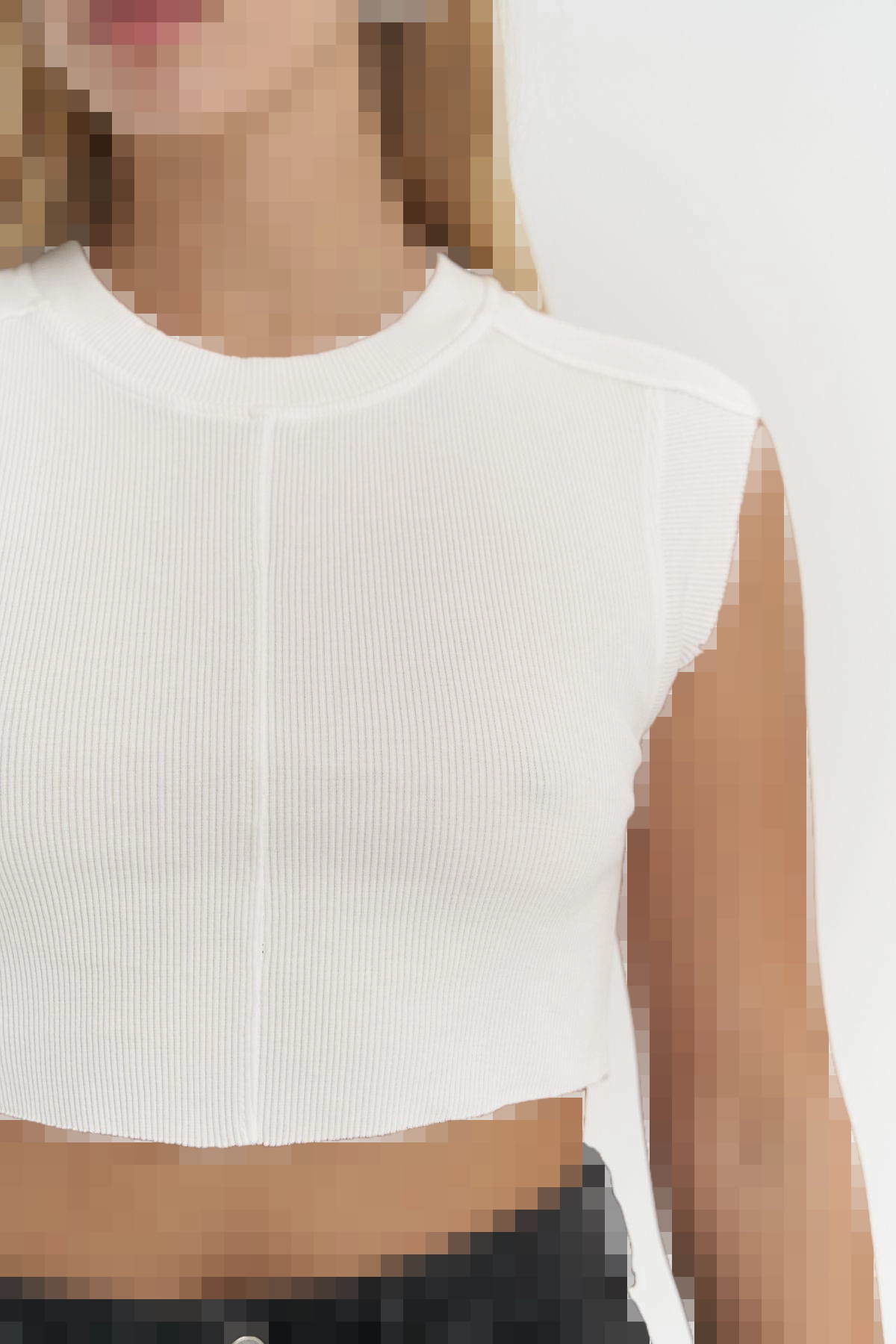 تاپ کوتاه از جنس پارچه راه راه شسته شده، آستین کوتاه، یقه گرد و نخی رنگ شده کمرنگ.