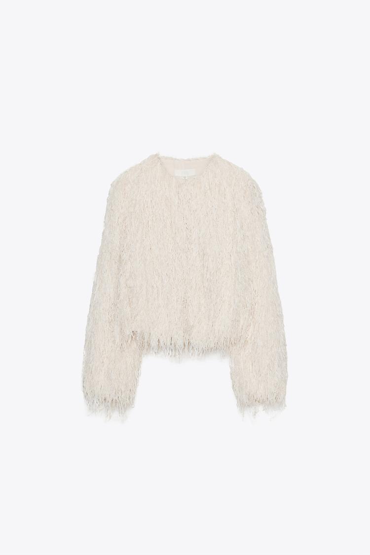 یقه گرد، ژاکت آستین بلند. جیبهای جلو. تزئینات کشسان. جزئیات پر و نخ فلزی. بست جلو با قلاب.